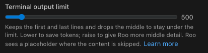 Truncates by lines. Roo keeps the beginning and end and drops the middle with an "[...N lines omitted...]" marker to stay under the limit. Mechanism: keeps approximately 20% of the head and 80% of the tail of the allowed line budget and inserts an omission marker, preserving a blank line before the tail for readability. Use when commands print many lines (e.g., long logs) and you mostly care about headers and final results. Avoid when important details are in the middle. Default: 500 lines.